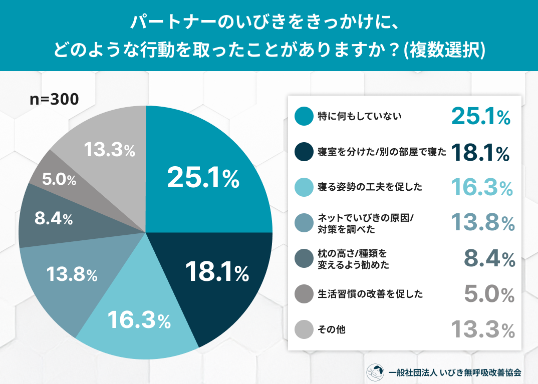 その他:13.3%(鼻づまり・アレルギー治療を勧めた:4.7%、医療機関に相談するよう勧めた:4.5%、寝室環境(加湿器など)を整えた:2.7%、その他:1.4%)