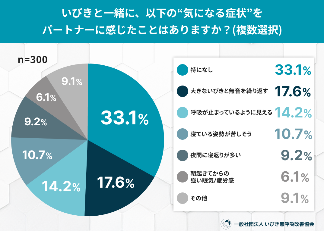 いびきと一緒に気になる症状では「呼吸が止まるように見える(14.2%)」などSASの疑いも