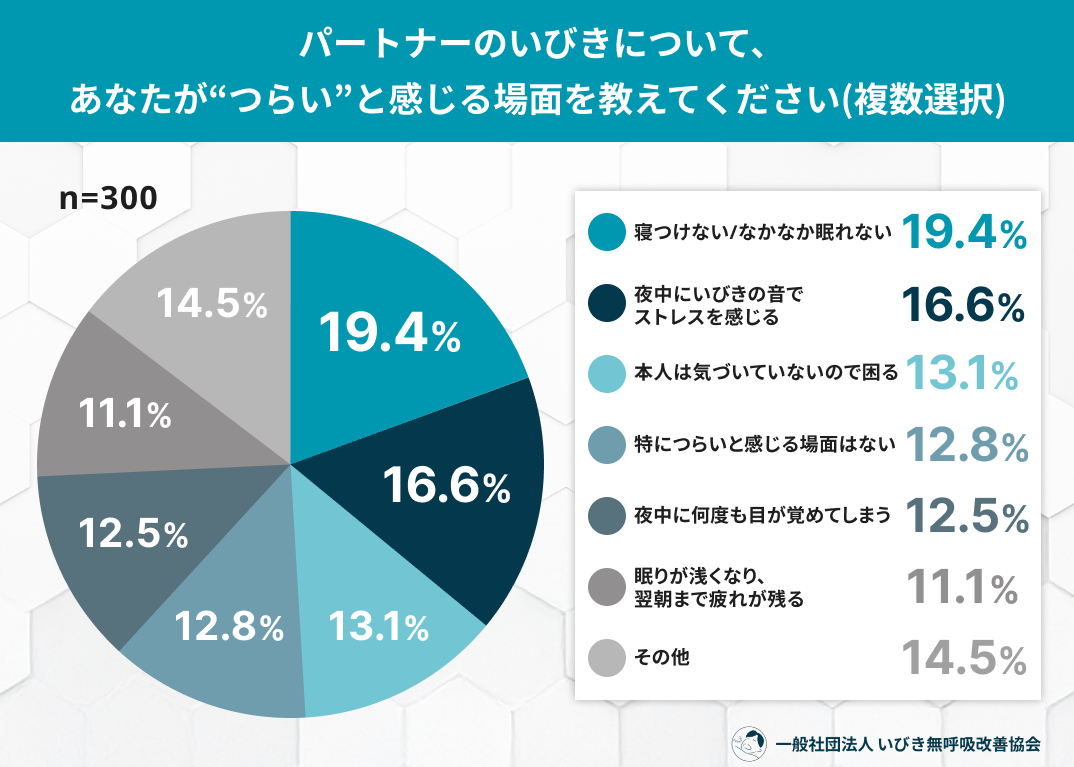 “つらい場面”トップは「寝つけない(19.4%)」「いびきの音にストレスを感じる(16.6%)」