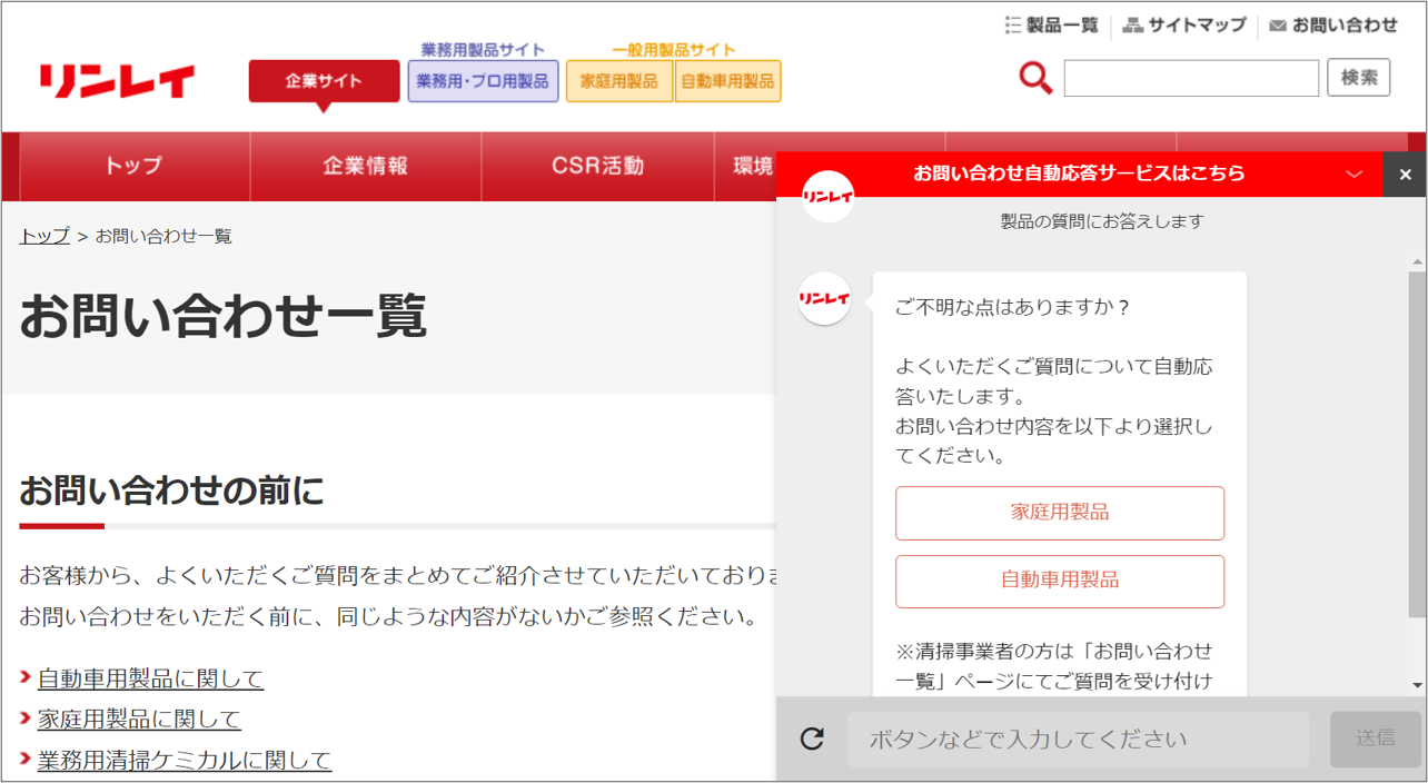 リンレイは、家庭・自動車・業務用のワックスやコーティング剤、衛生清掃製品等を開発・製造・販売する総合メーカーとして、各製品に関するお問合せをお客様相談室にて電話のみで対応されてきましたが、DX・デジタルを活用したサービス向上の第一歩として、受付時間外のお問合せにも対応可能な、AI自動応答ツールをご検討、アイアクトの『Cogmo Attend』を採用いただきました。