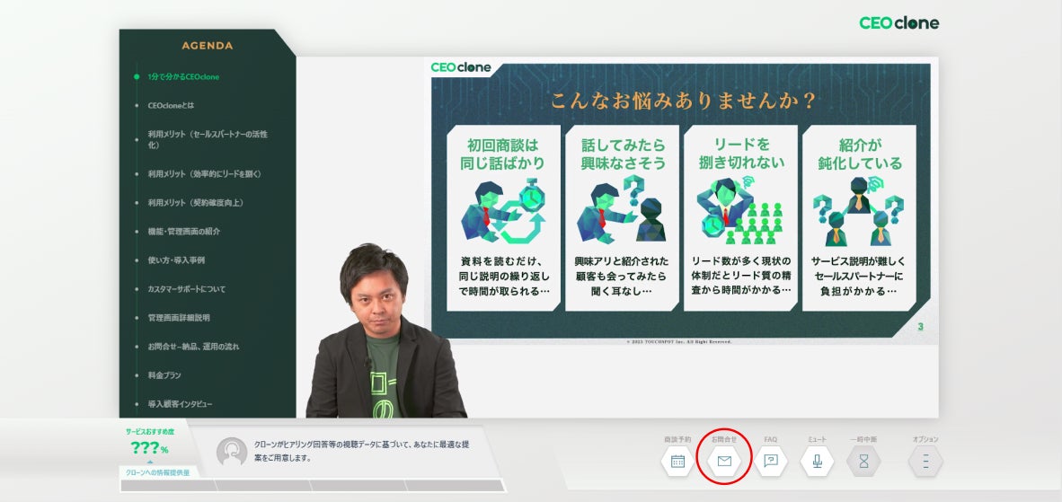 『CEOclone』は顧客毎のURLで展開され、ヒアリングの回答結果などのデータをもとに視聴者毎にパーソナライズされたアジェンダを生成、顧客の興味関心に合わせた提案を行います。
