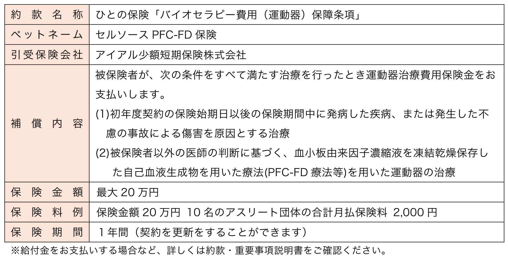 今回共同開発した保険商品は、変形性関節症やスポーツ傷害(スポーツによる身体のケガや障害)をはじめとする運動器疾患の治療・予防に効果が期待される「PFC-FD」を用いた自費診療に関し、対象の医療機関で受療した際にかかる費用を保険でお支払いするものです。