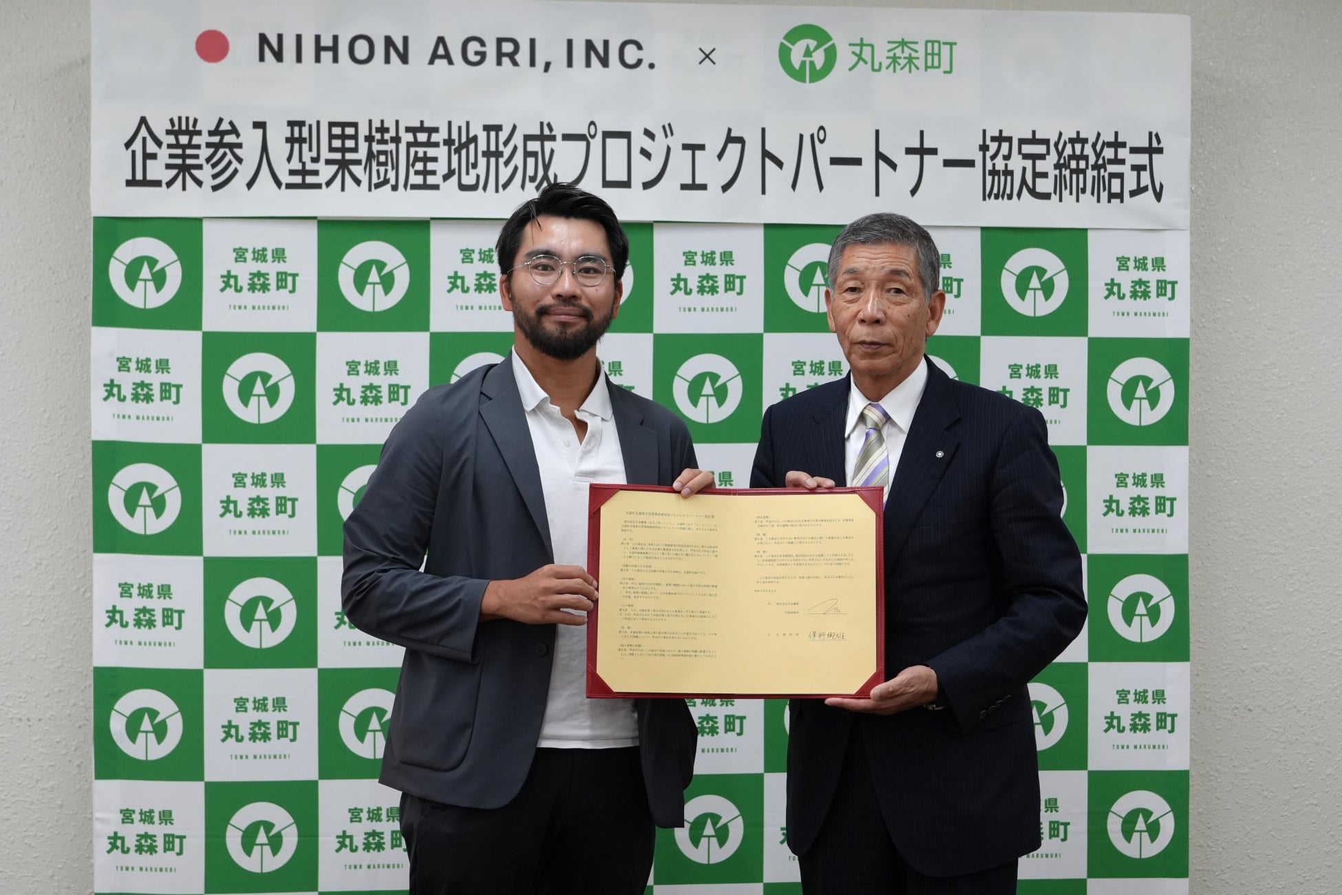 日本の農産物の生産から販売まで一気通貫で展開し、新たな産業構造を創出する株式会社日本農業(本社:東京都品川区、代表取締役CEO:内藤祥平、以下「日本農業」)は、“儲かる農業”に構造転換する「ニチノウ共創プロジェクト」の第2弾として、2025年6月2日に宮城県丸森町(町長:保科郷雄、以下「丸森町」)と丸森町企業参入型果樹産地形成プロジェクトパートナー協定を締結しました。