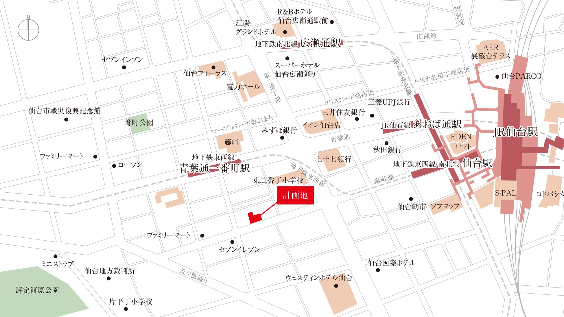 本計画は、仙台市地下鉄東西線「青葉通一番町」駅徒歩3分、JR「仙台」駅徒歩7分と、新幹線停車駅の徒歩圏内に立地。オフィス街である南町通に面しており、商業・賑わいの中心である東一番町通との交差点にも近接した高い利便性を有しています。今後も、当社は街や人に寄り添うオフィスづくりを積極的に進めてまいります。