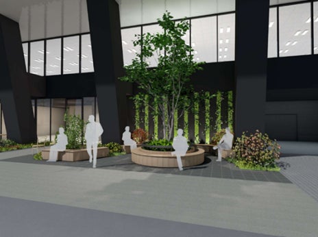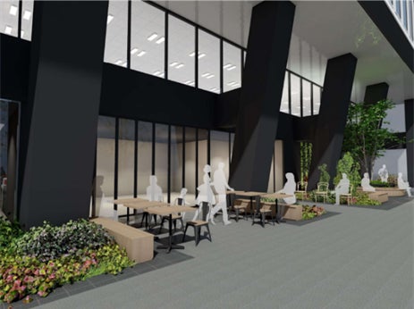 歩道状空地に面してベンチを配し、歩行者の安全を保ちながら、気軽に休憩できる空間に整備するとともに、多種多様な緑を置き、心も身体も休まるリフレッシュスペースにいたします。日射しが強い日や小雨でも利用出来るピロティも設け、オフィス利用者にとどまらず一般の方がコミュニケーションをとれる場所となる予定です。加えて、一階店舗前面にも、公共スペースを一体的に整備することで、新たな賑わいや活力を創出し、 都市環境の改善に繋がる計画とします。