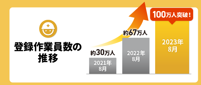 「Buildee」では「Buildee調整会議」のリリースを皮切りに、2019年12月には作業員の情報や顔写真登録を活用する「Buildee労務安全」と「Buildee入退場管理」、2023年4月には工事進捗の把握を効率化する「Buildee進捗・歩掛」をリリースするなど提供サービスを拡大してきました。また、建設キャリアアップシステム(CCUS)や建設現場ICT機器ソリューション「BANKEN」との連携、定期的なサービスアップデートの実施など利用者のニーズをくみ取ることで、多くの元請様の現場へ利用が広がり、それに比例し登録作業員数も急速に伸長いたしました。建設業就業者数における建設技能者が約300万人(※)と言われるなか、当社では108万人の登録作業員数を通過点と捉え、今後も多くの現場へ「Buildee」の活用が進むようさらなるサービス向上に取り組んでいきます。