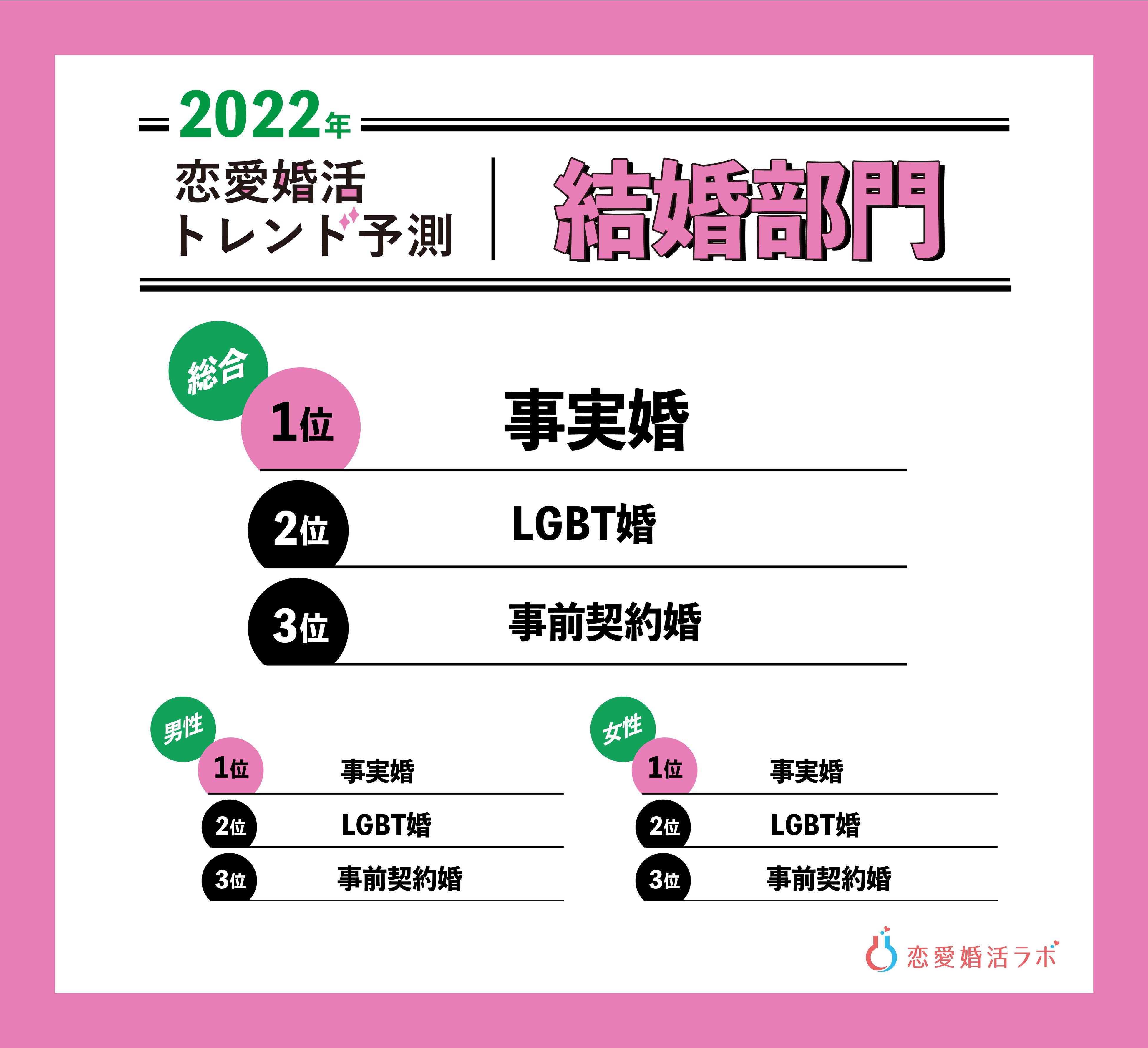 また、男女の燃えるような恋愛結婚が定番とされてきましたが、LGBT始め2022年はますます恋愛や結婚の形が多様化していくと思われます。コロナがきっかけで、今の状態が永遠に続くわけではないことを全世界の人間が身を持って知ることになりました。一生に一人のパートナーという概念が少しづつ変わろうとしています。例えば結婚前に家事の分担や結婚の期間や更新条件などを決める事前契約婚など、さまざまなライフスタイルや人生観に合った結婚の形や恋愛の形が増えていくと予想されます。