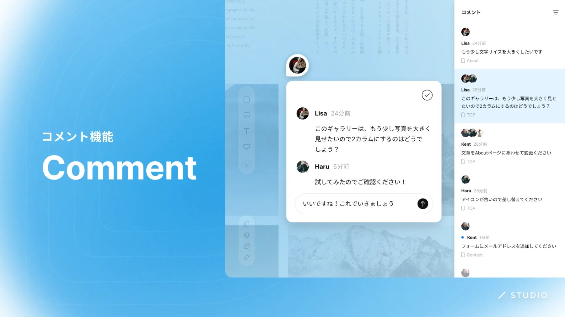STUDIO株式会社(本社:東京都渋谷区 代表取締役:石井 穣)は2024年4月、デザイン修正指示を効率化する新機能「コメント機能」をリリースしました。