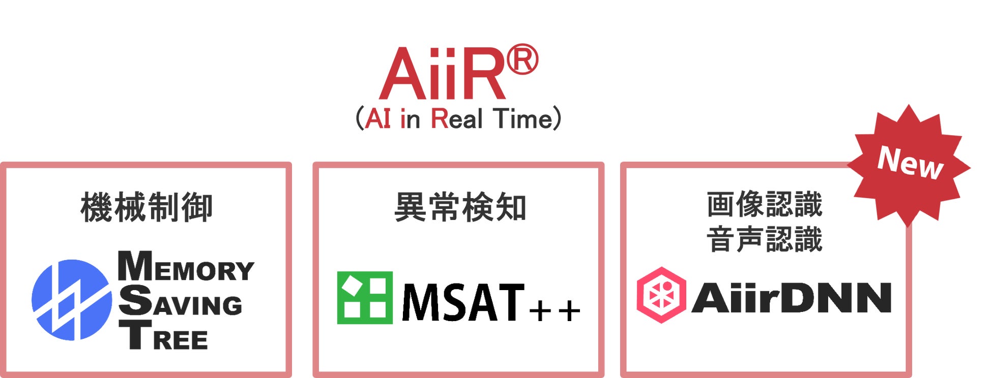 エイシングはこれまでに軽量性とオンデバイス学習機能をもつAIをAiiRシリーズとして独自開発してきました。今回リリースする『AiirDNN』は、機械制御向けAI 『MEMORY SAVING TREE』、異常検知向けAI 『MSAT++』に続く新しいAIです。