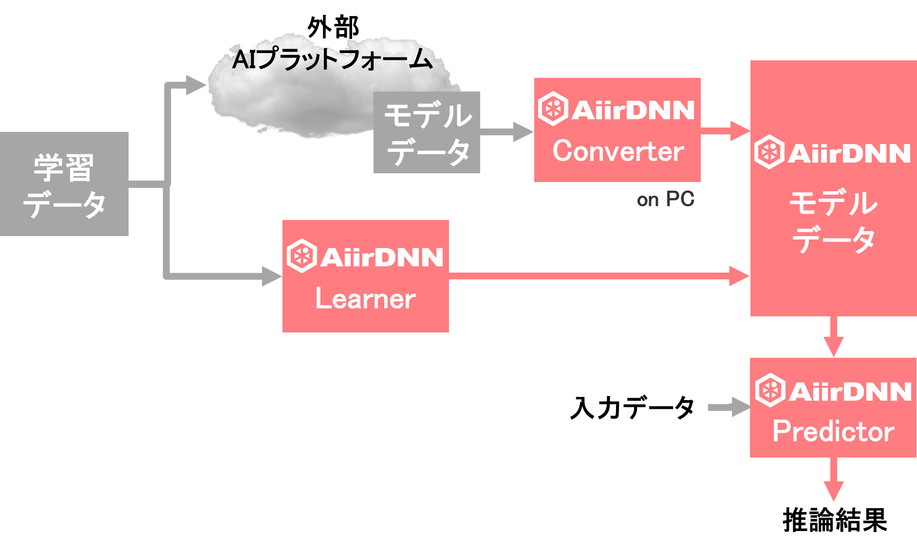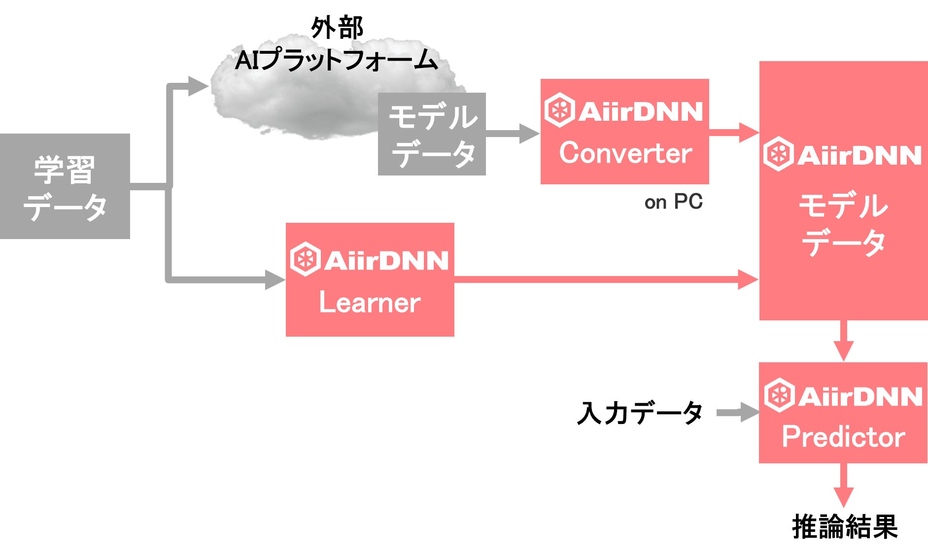 1つ目は、外部のAIプラットフォームで学習させて構築したAIモデルデータをAiirDNNで変換する方法です。メモリ容量をより小さく、かつオンデバイス学習が可能なAIモデルデータに変換することができます。量子化などの圧縮をしないため推論精度が低下することもありません。