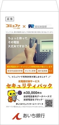 コミュファ光を提供する中部テレコミュニケーション株式会社(ctc)は、あいち銀行の愛知県内138店舗のATMコーナーに設置される現金封筒10万枚に、特殊詐欺被害防止に貢献する「光電話付加