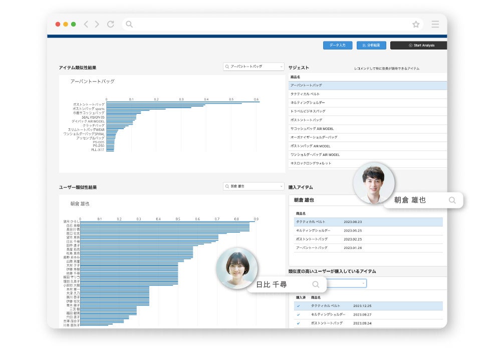 購買情報を基に、高度な類似度分析をベースにした複雑な計算をBigQuery※により実行。5万件のデータも僅か30秒で分析ができる迅速な計算を実現しました。これにより、アイテムの類似性やユーザーの類似性を算出し、リアルタイムで接客や様々な販促活動に活用する事が可能です。