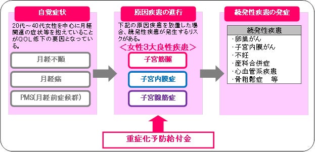 重症化予防給付金に加え、気軽に女性医師に相談できる当社のオンライン医療相談サービスを付帯サービスとすることで、より適切なタイミングでの病院受診の提案により器質性月経困難症の重症化予防を目指します。