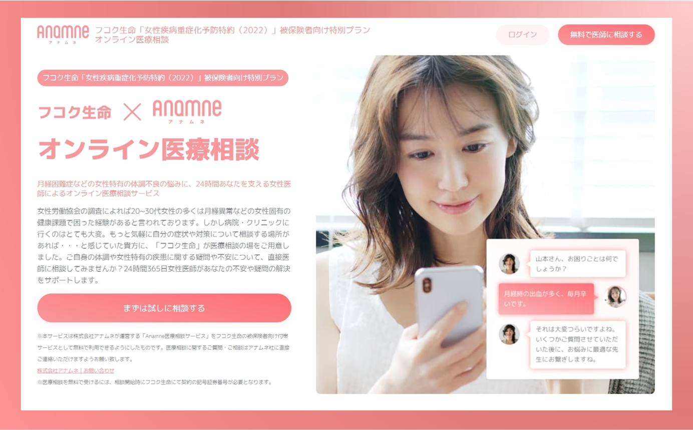 今回の付帯サービス導入により、富国生命「女性疾病重症化予防特約(2022)」の被保険者は、アナムネのオンライン医療相談を無料でご利用いただけるようになります。