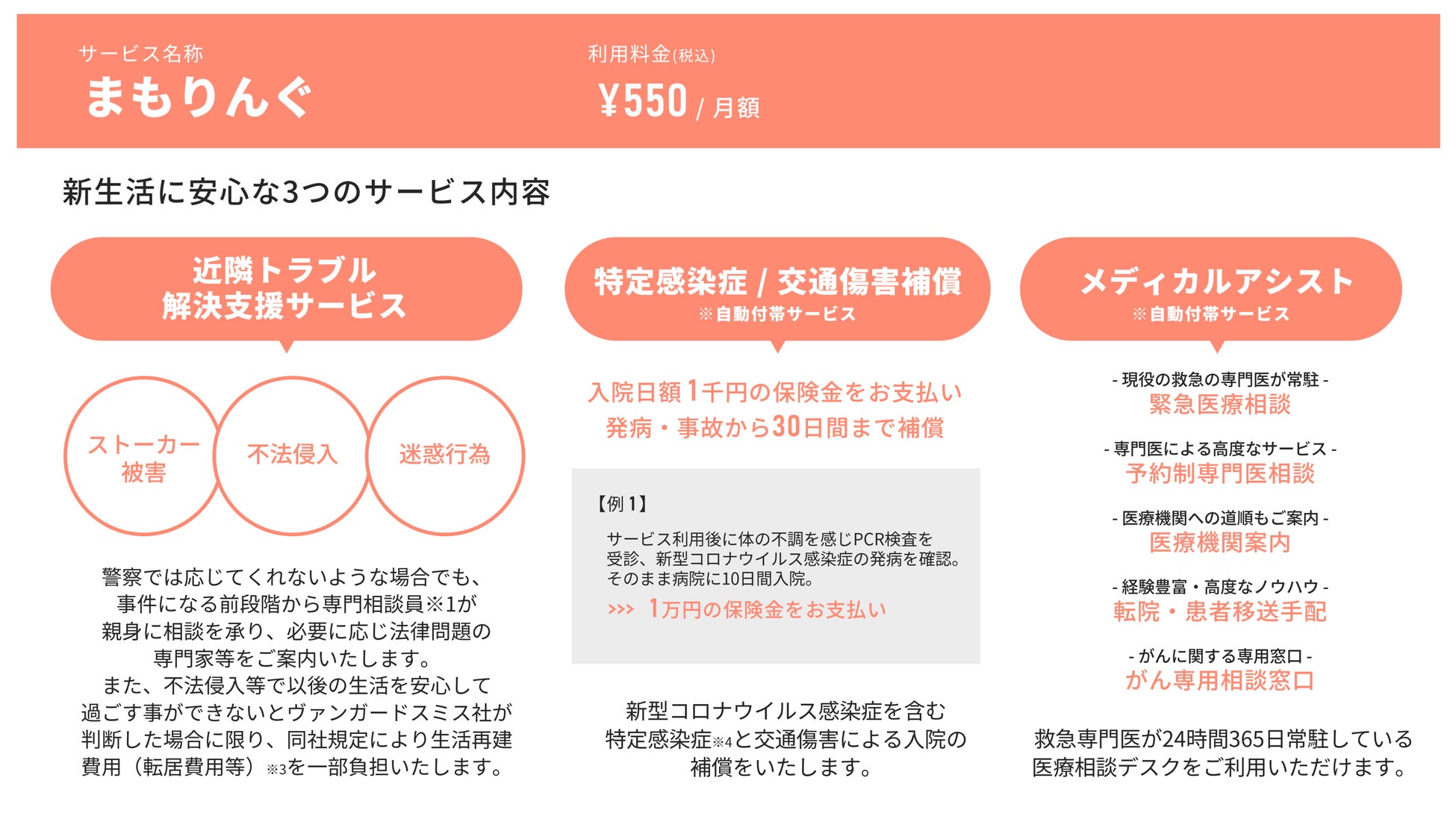 本サービスは、下記サービス提供会社と当社との契約に基づき、当社が販売会社として自動付帯保険(「特定感染症補償」、「交通傷害補償」、「メディカルアシスト」)付きの「近隣トラブル解決支援サービス」(Pサポ)を「まもりんぐ」として販売(※4)いたします。