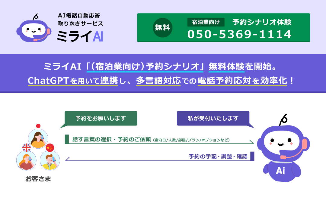 ミライAI「(宿泊業向け)予約シナリオ」無料体験を開始。ChatGPTを用いて連携し、多言語対応での電話予約応対を効率化!