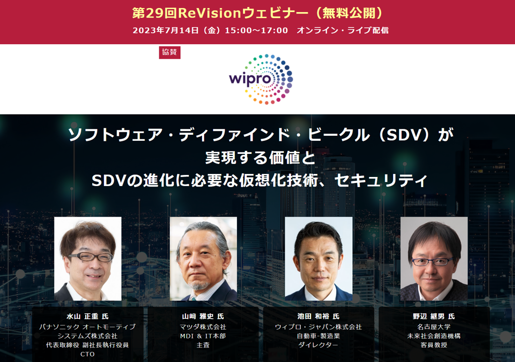 【無料WEBセミナー】パナソニック、マツダ、ウィプロ、名古屋大から講師を迎え、「ソフトウェア・ディファインド・ビークル(SDV)と仮想化技術、セキュリティ」についてライブ配信 ― 7月14日(金)