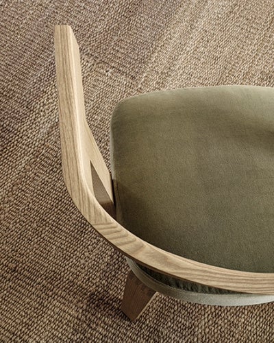 U字型に湾曲した無垢材のフレームは、背もたれからアーム、アームから座面、脚部とそれぞれの箇所に応じて曲げ木、フィンガージョイントなどで構成されており、人間工学に基づく設計により包み込まれるような快適な掛け心地を実現しています。