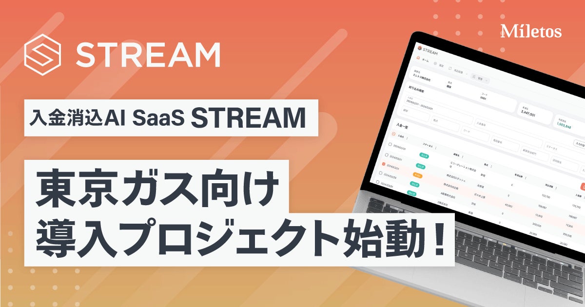 AIテクノロジーでビジネスプロセスをモダンプロセスへと変革させるMiletos株式会社(東京都中央区、代表取締役社長 兼 CEO:髙橋 康文)は、東京ガス株式会社(東京都港区、取締役代表執行役社長:笹山 晋一)向けに、入金消込 AI SaaS『STREAM AI ARM(以下STREAM)』の導入プロジェクトを始動したことをお知らせします。