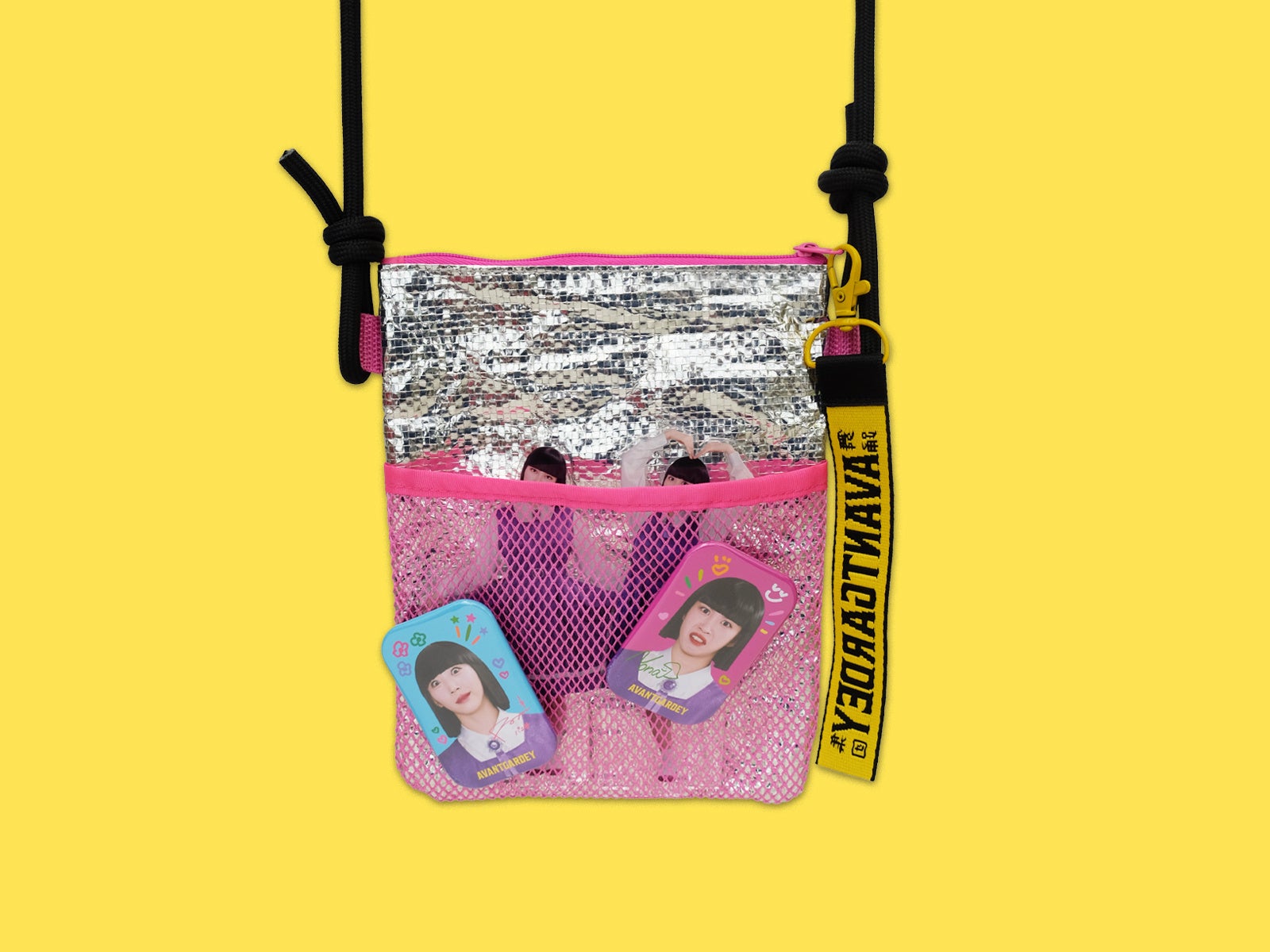 ピンクのネットポケットには、アクスタを入れたり、缶バッジを取り付けてお楽しみください!