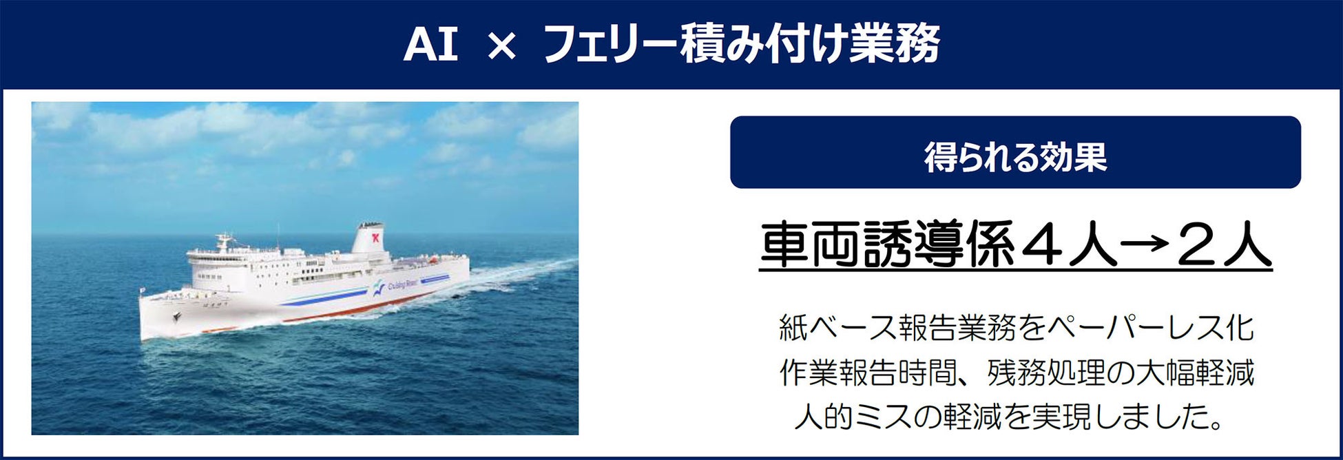 船内では、例えば、最大積載数約80台・フロア数2階のフェリーが、出入り口が1方向という条件の中で複数の港に寄港しながら貨物の積み付け方を実施すると膨大な作業指示が積み付け作業中に出ます。それら膨大な作業指示の中から、積み降ろし作業時に安全に作業できる船内スペースを確保することなどの制約条件を満たした積み付け作業を実施することは非常に複雑になっているが、それら全てを紙ベースで業務を実施しております。