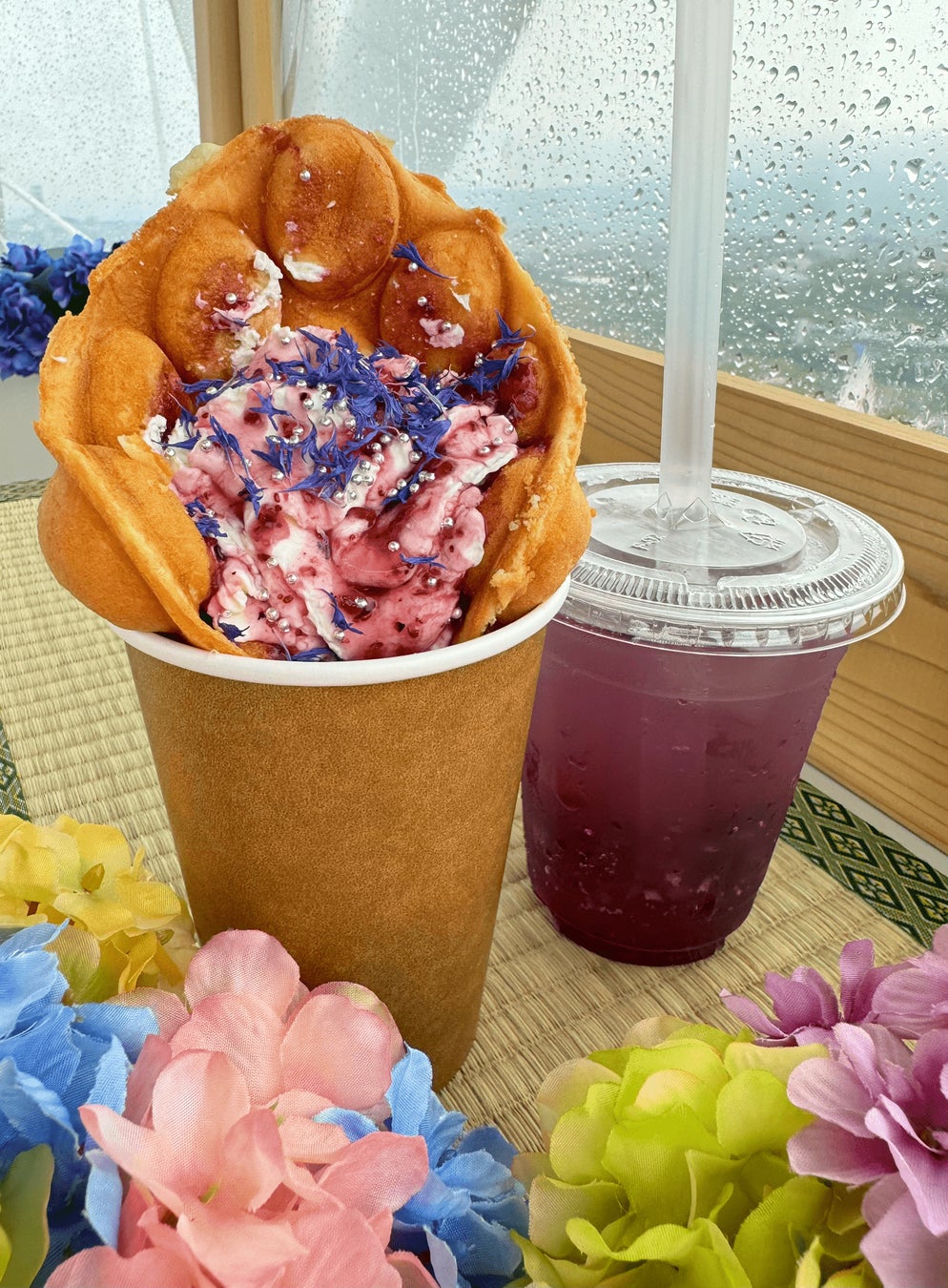 ・あじさいドリンク・あじさいワッフルを受け取り“あじさい観覧車”へ乗車