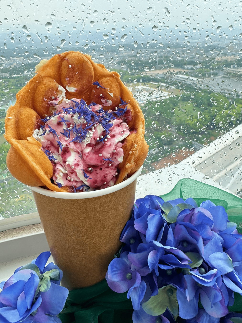紫陽花をイメージした「宝石のようなドリンク」と「お花がキラキラ咲いているワッフル」がセットになったプランが登場。流行りのニュアンスカラーが詰まったあじさい観覧車から見る日本一の高さからの景色が絶景!