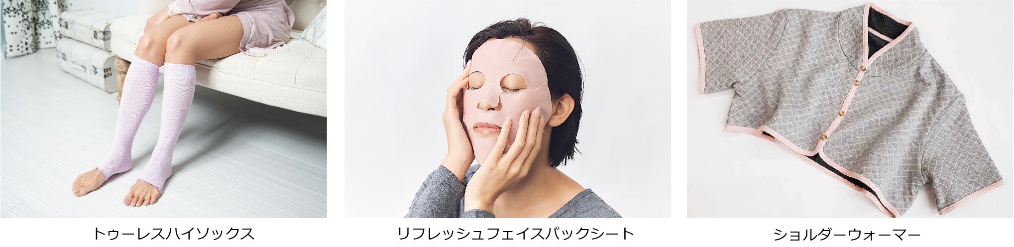また、10月14日よりクラウドファンディング「CAMPFIRE」にてスタートいたします、遠赤外線を放出するテラヘルツ人工鉱石を配合した洗って繰り返し使える「リフレッシュフェイスパックシート」と、パジャマブランド「極眠」より極眠×整 の「ショルダーウォーマー」を展示、数量限定で先行販売をさせていただきます。