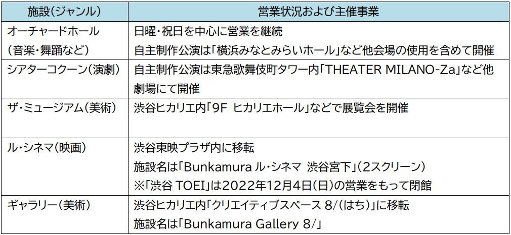 なお、当社はBunkamuraの休館中も渋谷を含め東急線沿線の周辺施設や東急グループ各施設などで文化事業を継続してまいります。また、オーチャードホールにつきましては日曜・祝日を中心に営業を継続いたします。