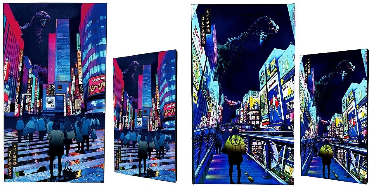版三が制作した「ネオン浮世絵ゴジラ」は 「新宿之図」と「大阪之図」の2種類。どちらも日常の中の非日常感をドラマ仕立て表現しています。サイバーパンク風ネオンカラーの美しさとホラーの趣ある神秘的な世界をお楽しみください。