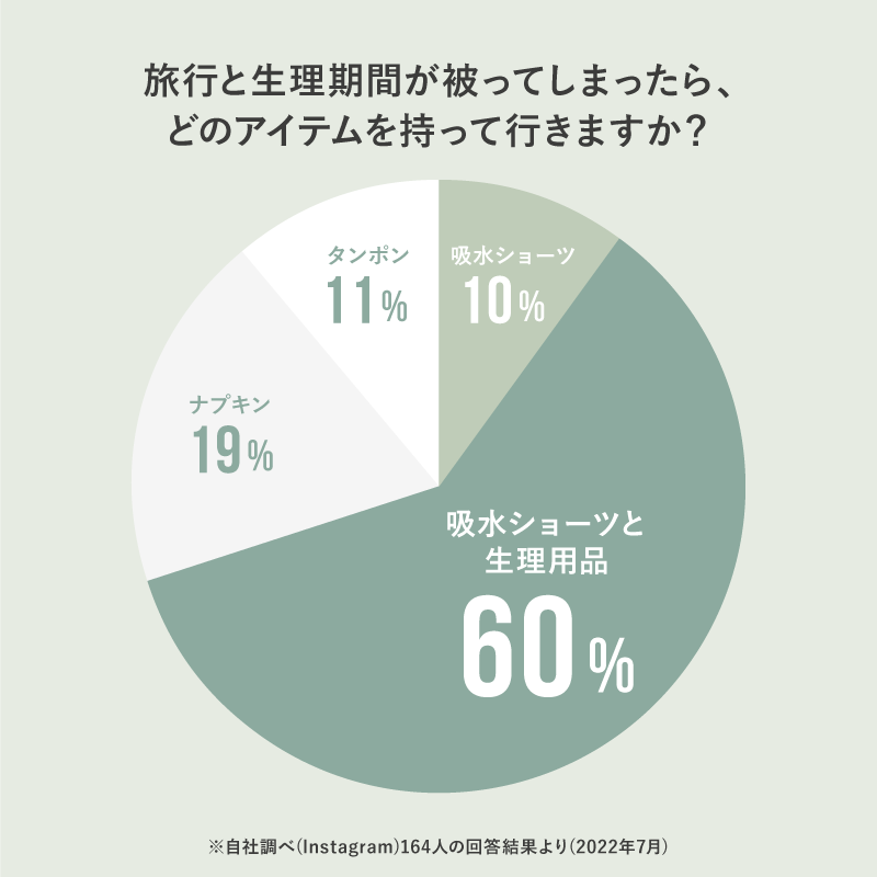 Nagiユーザーに向けて行ったアンケートでは、「旅行と生理期間が被ってしまったら、どのアイテムを持って行きますか?」という質問に70%が吸水ショーツを活用すると答えました。吸水ショーツを使用することでモレの不安を軽減することができ、1枚あれば予定外の生理の備えとしても安心です。