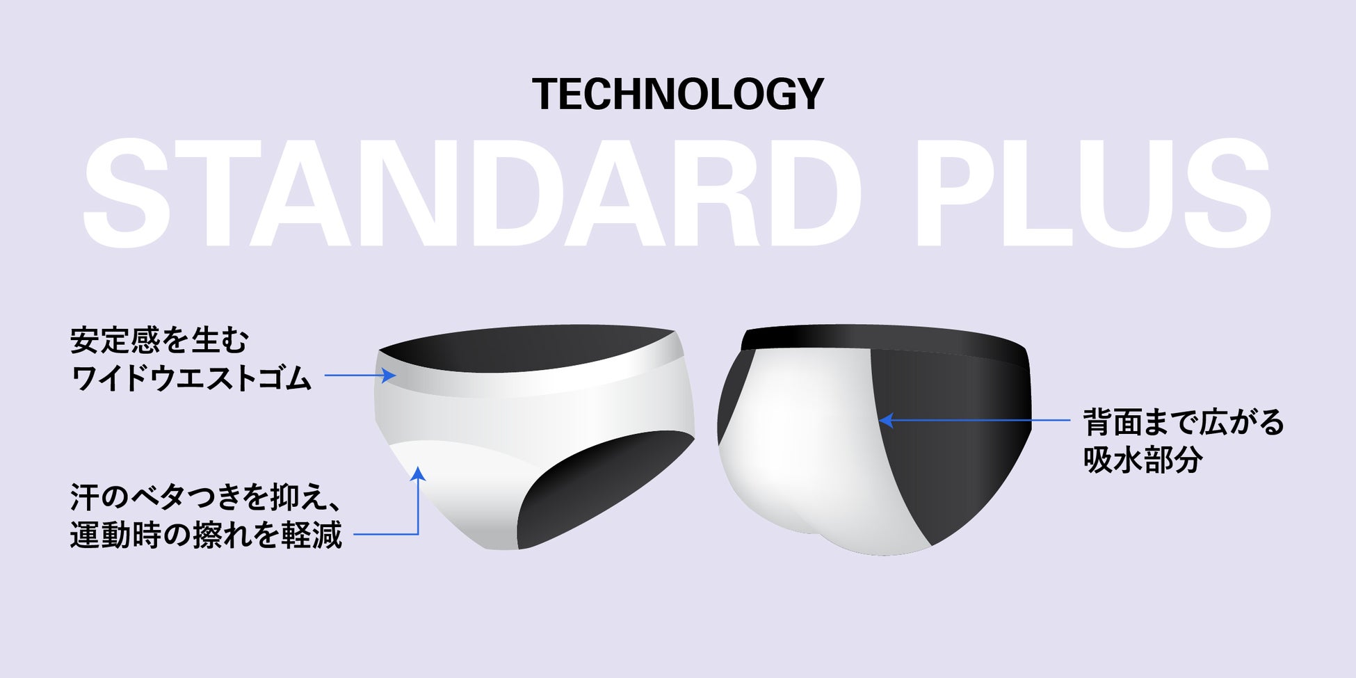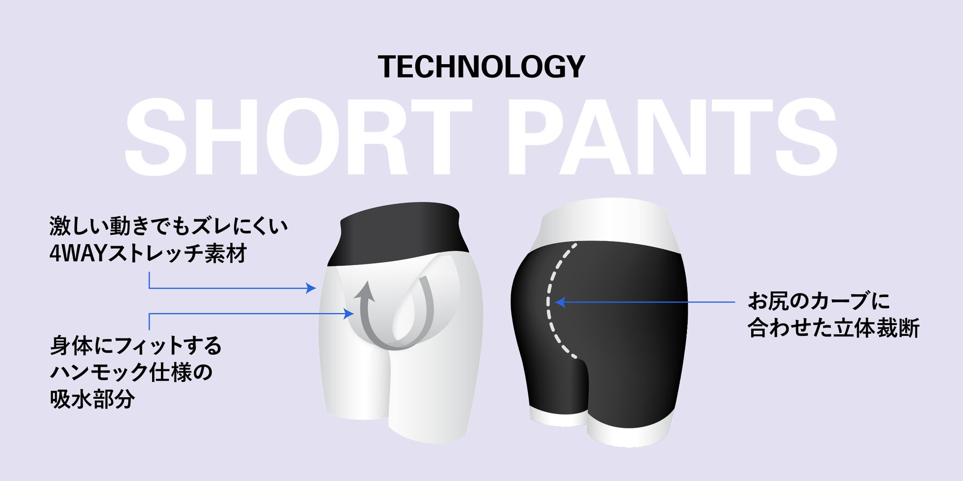 身生地には吸汗速乾機能に加え、アクティブな動作に適した4WAYストレッチ素材を採用。より伸縮性とパワーがあり、思いきり自由に動けます。ヒップ部分は立体裁断でお尻のカーブにぴったりフィット。吸水部分はハンモック仕様で身体に沿いやすいのでズレにくい構造になっています。