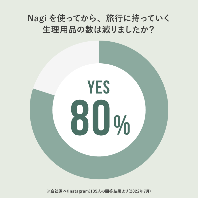 また、洗ってくり返し使うことができるため、特に長期間の旅行時には生理用品の荷物を減らすことも可能です。実際にユーザーの80%が、「Nagiを使ってから、旅行に持っていく生理用品の数は減りましたか?」という質問にYESと回答しました。吸水ショーツは、旅行の不安を軽減したり、荷物を減らせるアイテムといえます。
