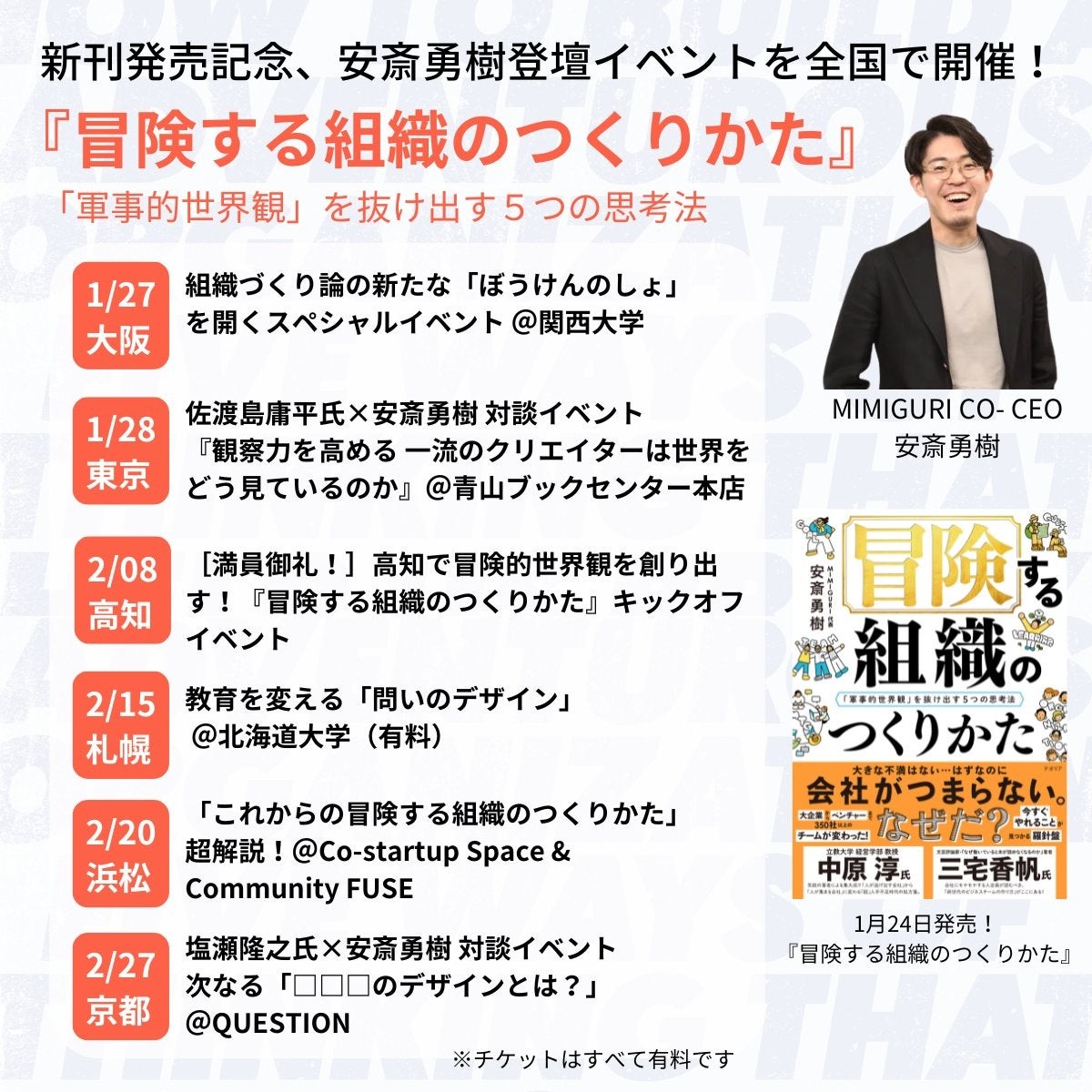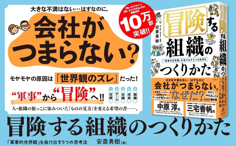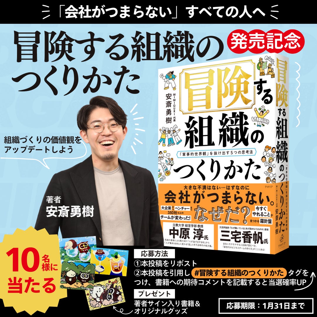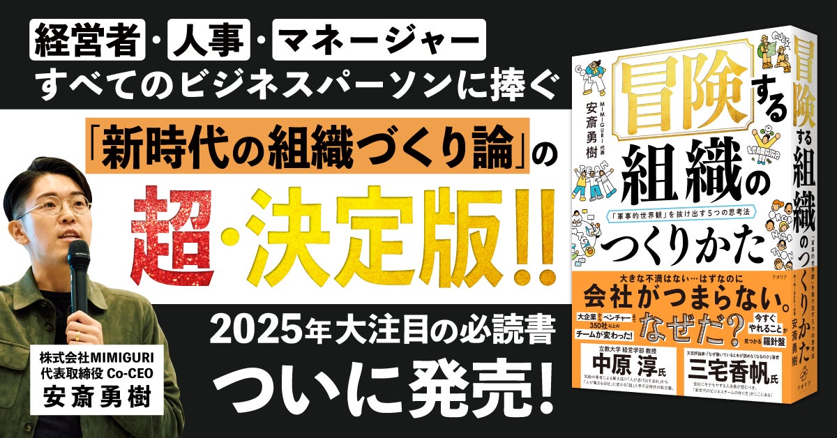 株式会社MIMIGURI(本社:東京都文京区、Co-CEO:ミナベトモミ、安斎勇樹、以下「MIMIGURI」)は、代表取締役 Co-CEO 安斎勇樹による新著『冒険する組織のつくりかた 「軍事的世界観」を抜け出す5つの思考法』(発行:テオリア/発売:ディスカヴァー・トゥエンティワン)が、2025年1月24日(金)より販売開始されたことを発表いたします。