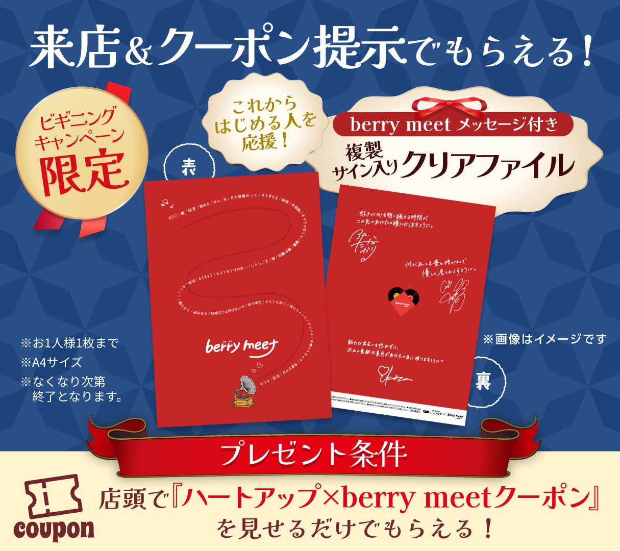 ハートアップ店舗に来店し、キャンペーンページの「ハートアップ×berry meetクーポン」をご提示いただいた方にプレゼントいたします。