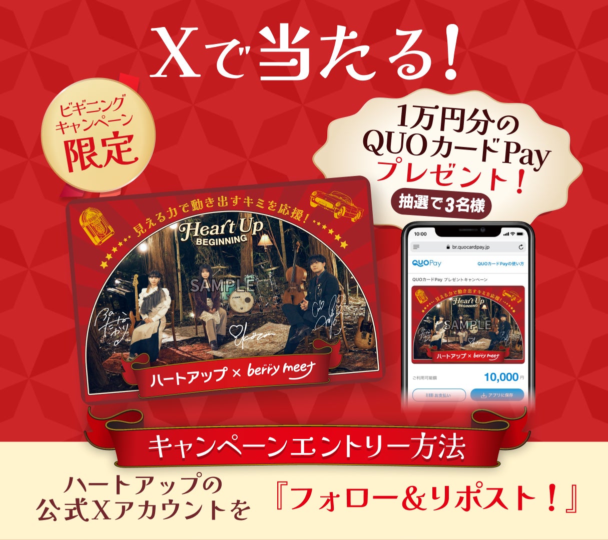 2026年3月19日(木) 8:00〜2026年4月10日(金) 23:59のキャンペーン期間中に、Xアカウント「ハートアップ(@ HeartUp_) 」をフォロー。ハートアップ公式Xアカウントからポストされる該当ポストをリポストされた方の中から抽選で3名様に1万円分のQUOカードPayをプレゼントいたします。