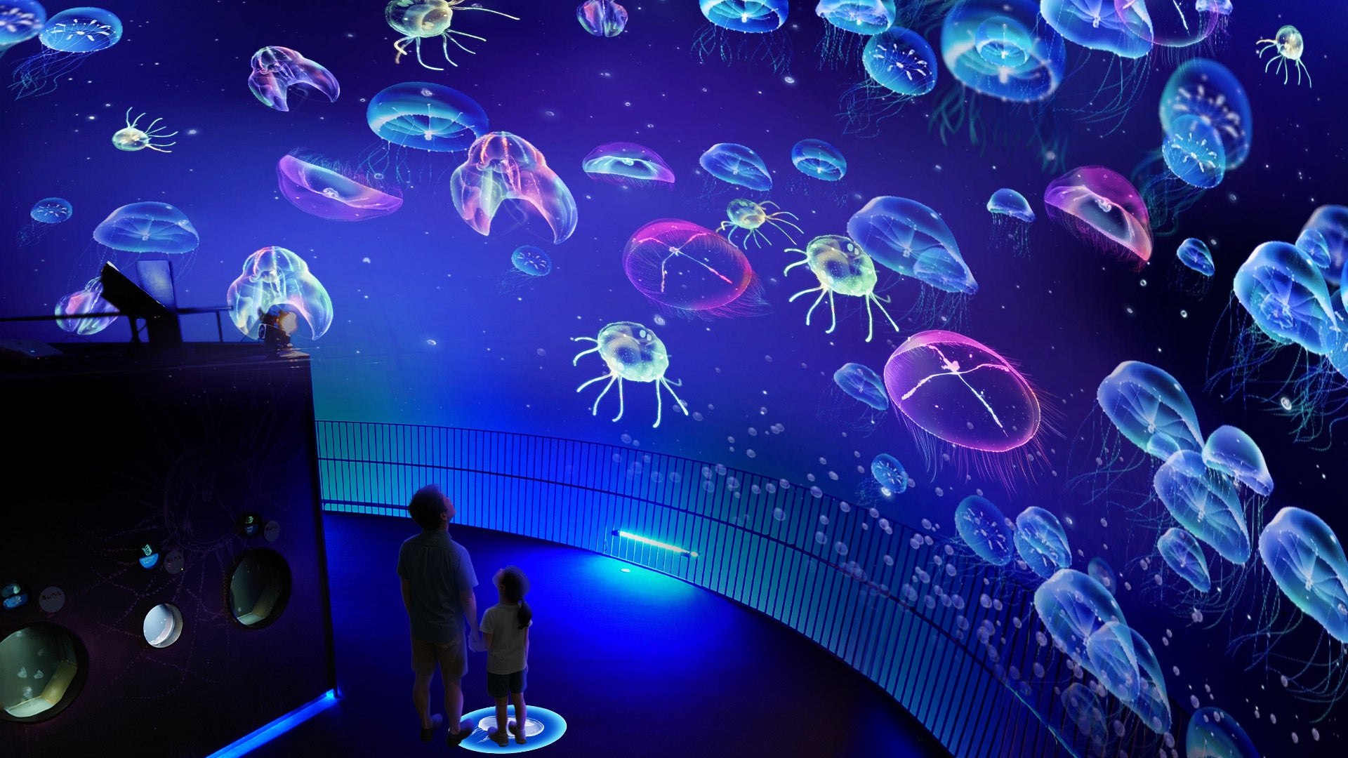 足元の一歩でドーム型スクリーンのクラゲ演出が変化する新体験
