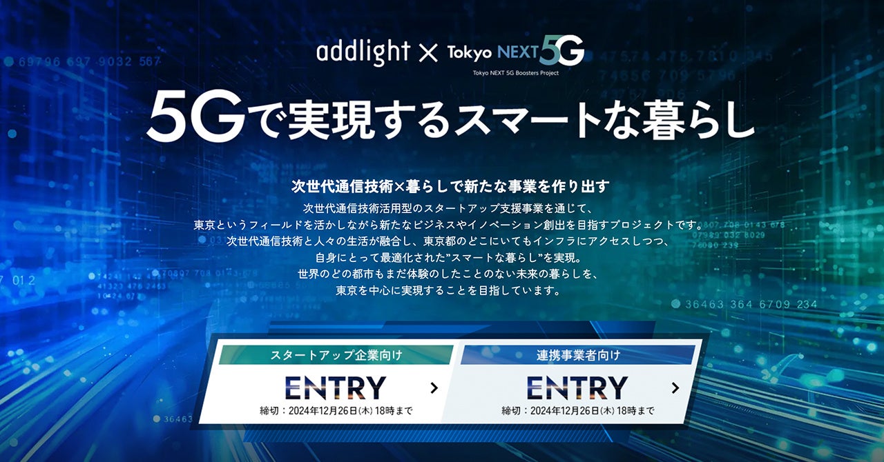 大手企業の新規事業開発を支援する株式会社アドライト(本社:東京都千代田区、代表取締役:木村 忠昭 以下、アドライト)は、2024年11月26日(火)より、東京都による次世代通信技術活用型スタートアップ支援事業『Tokyo NEXT 5G Boosters Project』(以下、本プログラム)の令和6年度採択開発プロモーターとして、支援対象となる次世代通信技術などを活用した製品・サービスの開発を行うスタートアップ企業と、実証フィールドの提供や技術、事業拡大のサポートを実施する連携事業者の募集を開始します。