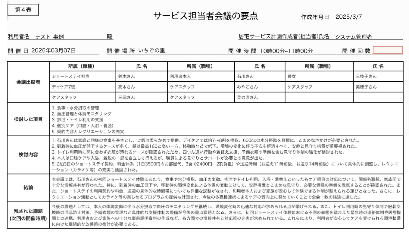 サービス担当者会議での発言内容を音声録音し、その場で文字起こしと帳票作成を行う機能です。また、録音データをアップロードすることでも自動作成が可能です。AIが発言内容を整理し、第4表に反映するため、会議後の書類作成にかかる時間を大幅に短縮できます。
