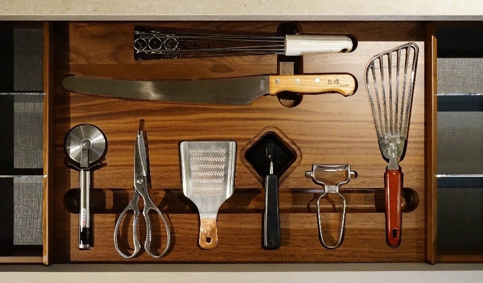 「どんな調理道具があったら便利か」、「毎日使わないけど必要な時にあったら便利な調理道具はなにか」。 ただ単に高価なものでなくたしかな土壌で培われた力と技でつくられた調理道具を厳選しました。 新潟県燕市が厳選した調理道具の「住所」を固定し、調理道具そのものの見せ場を提案する製品です。ウォールナットの積層無垢材は、調理道具の形状にあわせて丁度よく収まるよう加工を施しています。