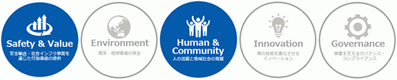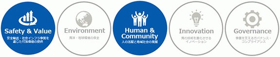 商船三井グループでは、事業を通じて優先的に取り組むべき社会課題として特定した「サステナビリティ課題」への対応を推進することで、持続可能な社会の実現に貢献します。本件は、5つのサステナビリティ課題の中でも「Safety & Value -安全輸送・社会インフラ事業を通じた付加価値の提供-」「Human & Community -人の活躍と地域社会の発展-」にあたる取り組みです。