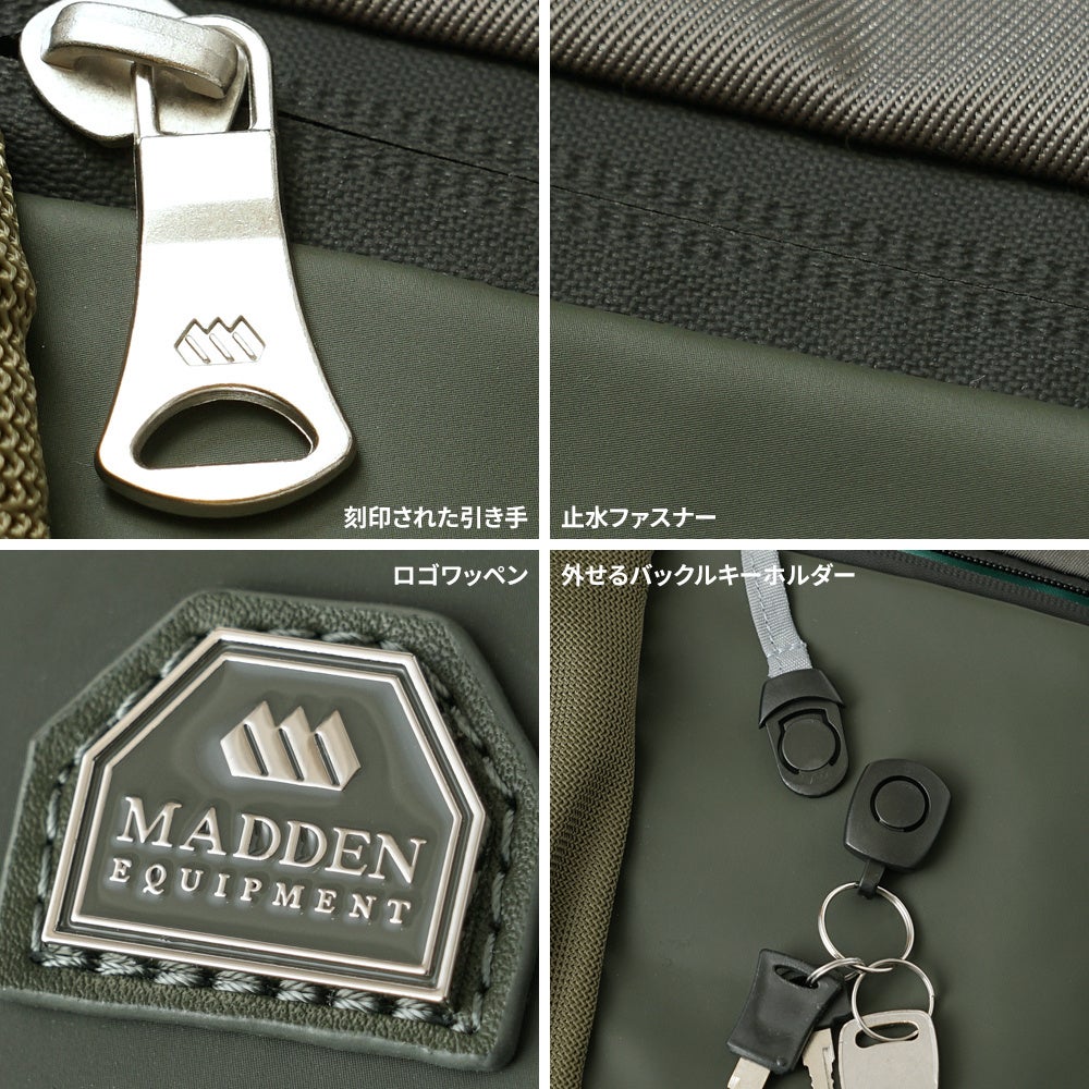 MADDEN EQUIPMENT(メデンイクイップメント)から、夏にぴったりの最新アイテムが新登場!ビジネスにも使えるオーセンティックなスタイルミリタリーな雰囲気を持ちつつワントーンの表現は都会的な印象も与えるデザイン。止水ジッパー付きのポケットの他キーホルダーやドロスト付きのボトルホルダーなど機能性の高さも魅力的。多少の水濡れなど気にならない高い防水性と軽量化を実現したON/OFF兼用で使える仕上がり。
