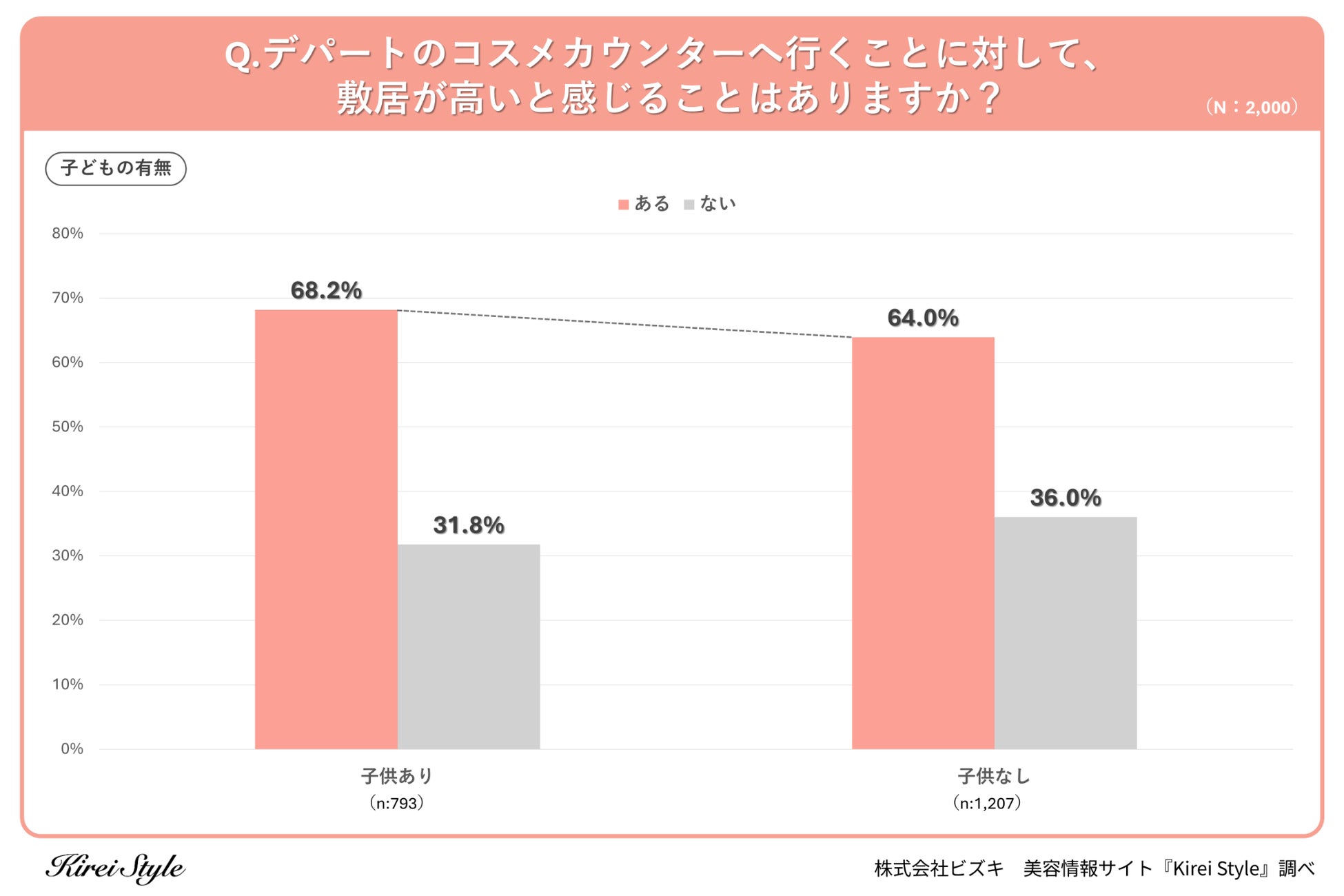 子どもの有無で見ると、敷居が高いと感じることがある方は「子どもあり」が4.2%上回る結果となりました。小さい子どもがいる場合、詳しい説明を聞くことやタッチアップをしてもらうには時間がかかってしまったり、店舗スペースが限られているため子どもを連れて行くには狭すぎたりと、デパートのコスメカウンターへの訪問を躊躇してしまっている可能性が伺えました。