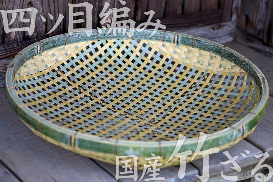 また、丈夫で身の厚い孟宗竹を使用した縁に四ツ目を編み込み、頑丈な仕上がりとなっています。使い込むほどに青々とした色合いが落ち着き、風合いが増すのも特徴です。自然素材の竹を使用し、薬剤処理を行わないため、ご使用頻度や保管方法によって異なりますが、お手入れ次第で、長くご愛用いただけます。