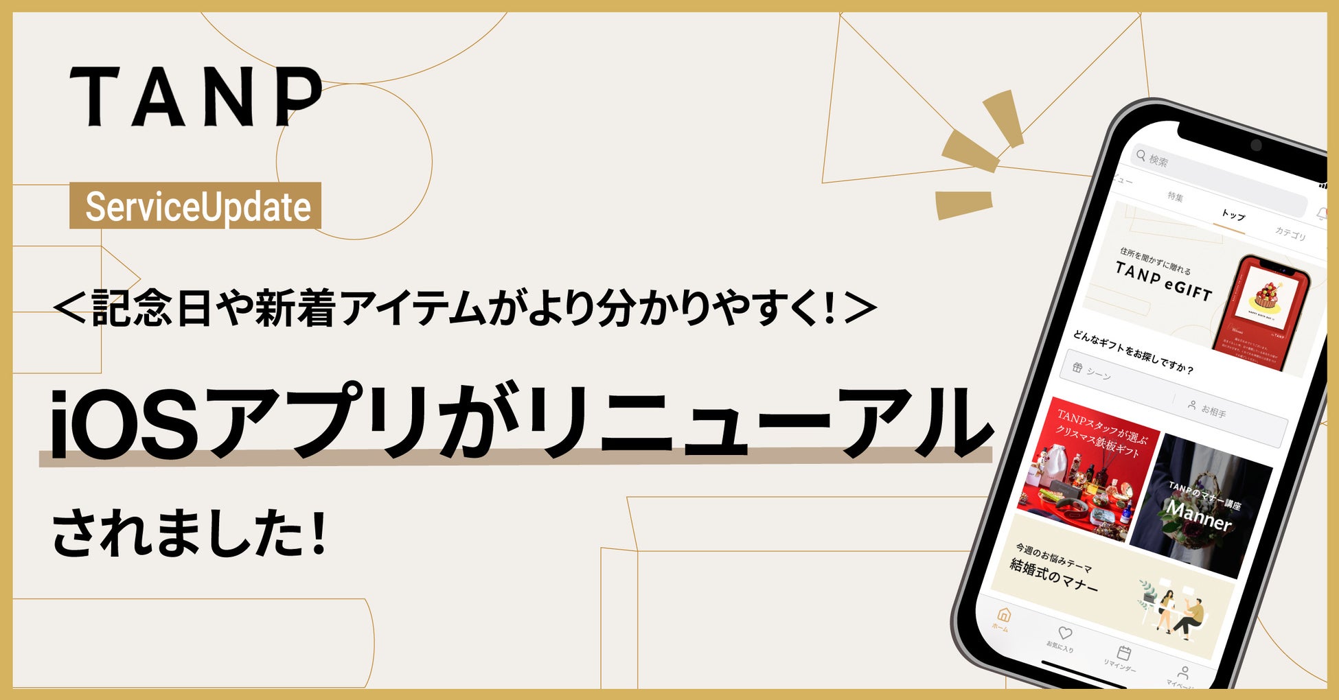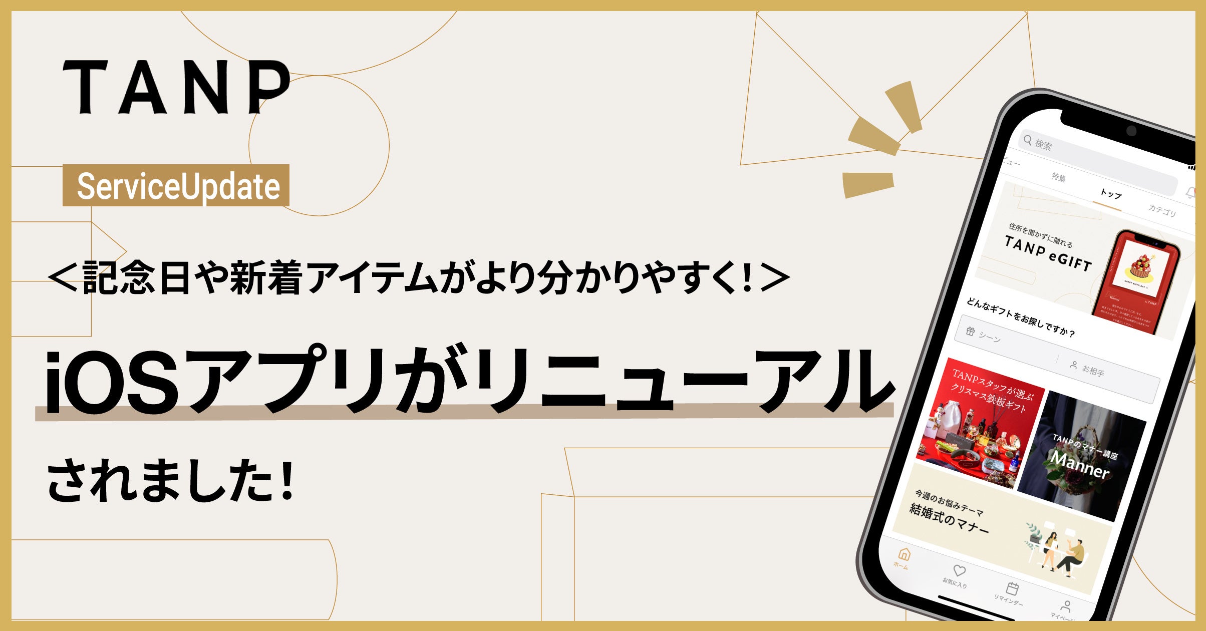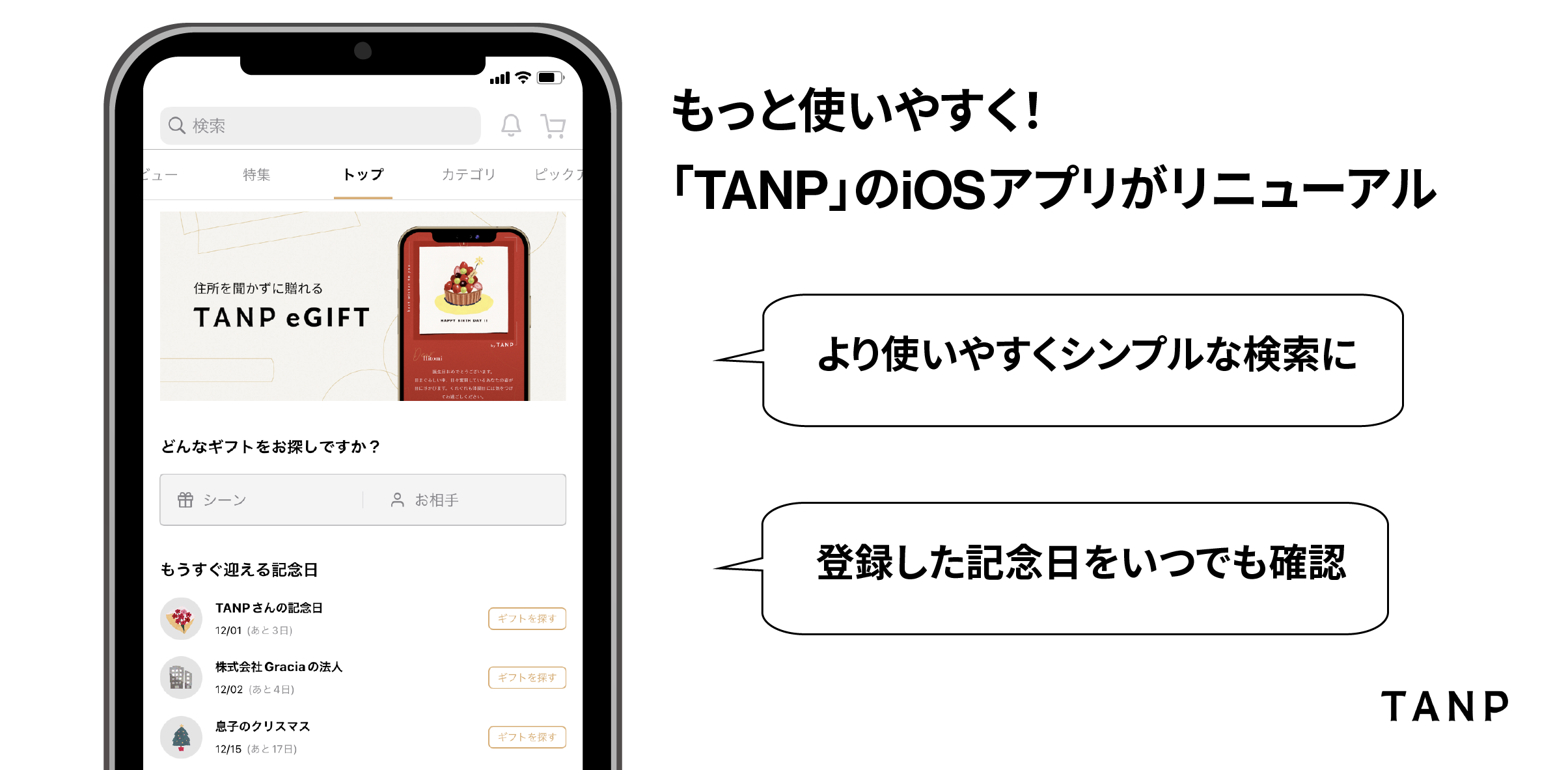 ギフトEC「TANP」、公式iOSアプリがリニューアル!記念日や新着アイテム表示などアップデート