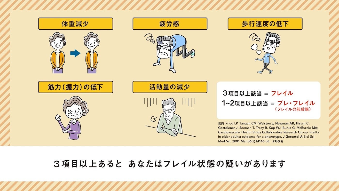 下記の5項目のうち、3項目以上該当する場合はフレイル状態、1~2項目該当する場合はプレ・フレイル(フレイルの前段階)である疑いがあります。当てはまらなくても、日ごろから対策をしていくことが重要です。
