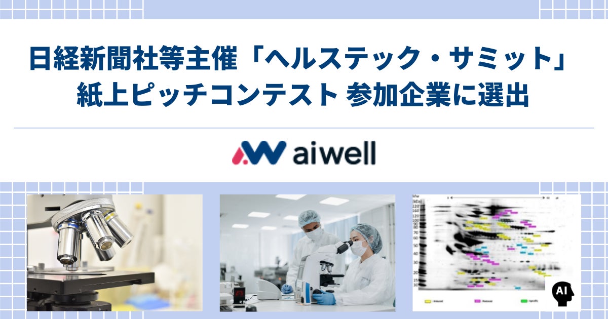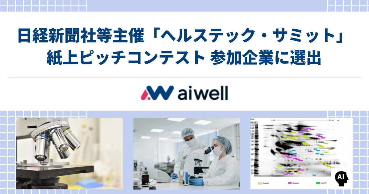 次世代のタンパク質網羅的解析技術(AIプロテオミクス)の実用化と社会実装を進めている東工大発ベンチャー認定企業 aiwell株式会社(本社:東京都千代田区、代表取締役:馬渕 浩幸)は、日本経済新聞社とメドピア株式会社が共同開催する国内最大規模のヘルステックカンファレンス「Healthtech/SUM(ヘルステック・サミット)」内の「ヘルスケアスタートアップコンテスト」の参加企業に選出されたことをお知らせいたします。