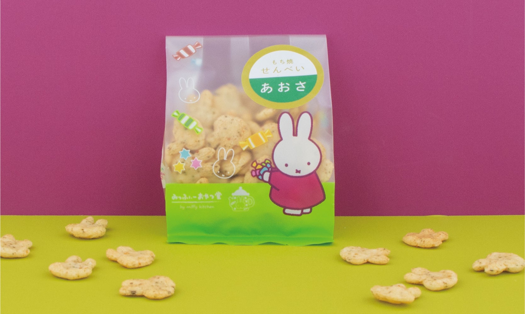 大人気の「みっふぃーあられ」に磯香る「あおさ」味が仲間入り致します。うるち米を原料に、ミッフィーの形にくりぬいて香ばしく焼き上げました。