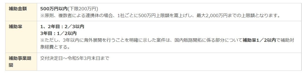 | 補助率 | 1、2年目:2/3以内 3年目:1/2以内 ※ただし、3年以内に海外展開を行うことを明確に示した案件は、国内販路開拓に係る部分について補助率1/2以内で補助対象経費とする。 |