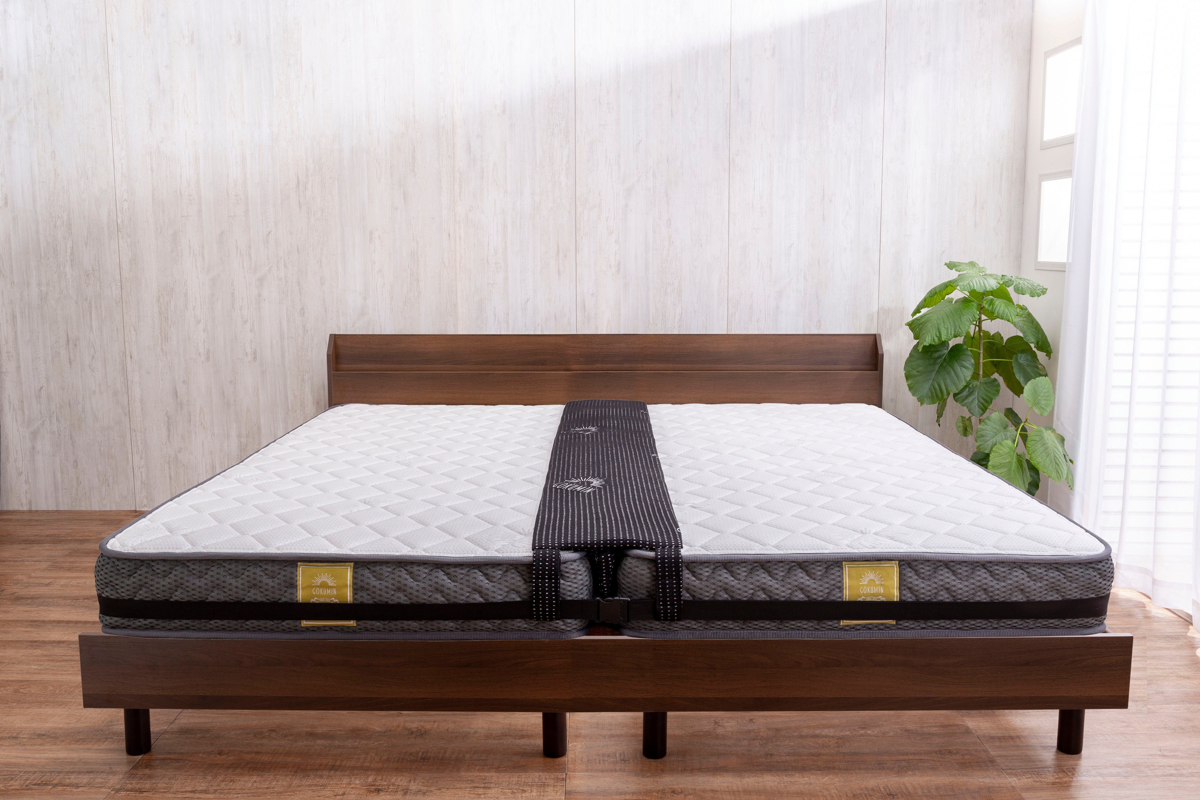 2. パット幅30cmのワイド設計で安定感抜群、長さも標準的なマットレスの長さと同じ195cm。頭の先から足先までしっかり隙間を埋めます。幅4.2cm長さ10mの固定ベルトは、ベッド幅最大300cmまで幅広く対応。セミシングル〜ダブルの2台連結が可能です。